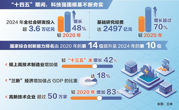 “這五年,科技創(chuàng)新能力穩(wěn)步提升,科技強國根基不斷夯實。”陰和俊說,我國科技投入持續(xù)增加,2024年全社會研發(fā)投入超3.6萬億元,較2020年增長48%;基礎(chǔ)研究經(jīng)費達2497億元,較2020年增長超過70%,在量子科技、生命科學、物質(zhì)科學、空間科學等領(lǐng)域取得一批重大原創(chuàng)性成果;國家實驗室體系建設(shè)穩(wěn)步推進,國家科研機構(gòu)、高水平研究型大學科研能力不斷提升,科技領(lǐng)軍企業(yè)加快培育成長;北京、上海、粵港澳大灣區(qū)國際科創(chuàng)中心支撐引領(lǐng)和輻射帶動作用不斷增強,深圳-香港-廣州躍居全球百強創(chuàng)新集群榜首;國家綜合創(chuàng)新能力排名由2020年的第14位提升至2024年的第10位。