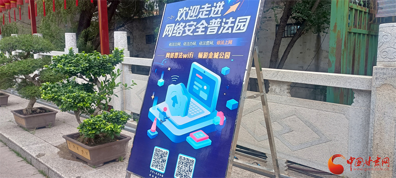“我們這個主題公園的最大特色是上網(wǎng)免費,游客只要掃二維碼答題,就能使用免費的WiFi學(xué)習(xí)法律知識。”西固區(qū)委網(wǎng)信辦副主任蔡繼萍指著金城公園門口的掃碼指示牌介紹,游客掃一掃,公園上網(wǎng)全免費。