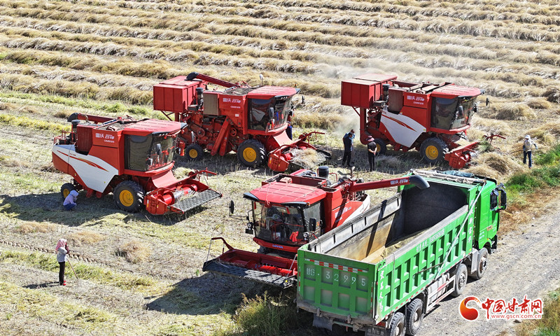 8月24日,在民樂縣新天鎮(zhèn)韓營村千畝油菜種植基地,村民駕駛農(nóng)機在田間開展油菜籽搶收作業(yè)。