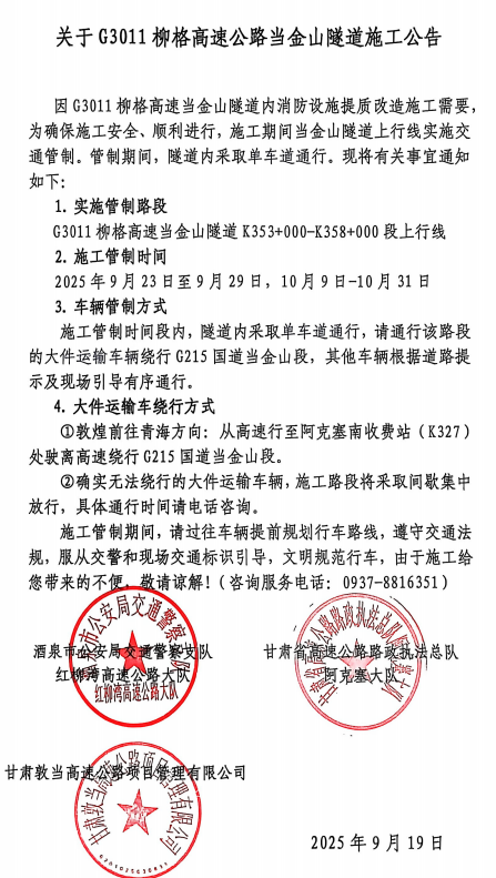 中國甘肅網(wǎng)9月22日訊(西北角·中國甘肅網(wǎng)記者 宋芳科)記者從敦當(dāng)高速公路項(xiàng)目部門獲悉,因G3011柳格高速當(dāng)金山隧道內(nèi)消防設(shè)施提質(zhì)改造施工需要,為確保施工安全、順利進(jìn)行,2025年9月23日至9月29日,10月9日至10月31日,兩個(gè)時(shí)間段,G3011柳格高速當(dāng)金山隧道K353+000-K358+000段上行線將實(shí)施管制。國慶期間停止施工,保障通行。