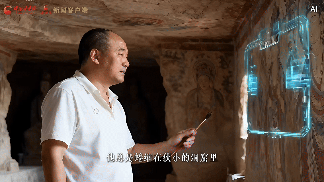 李波接過父親李云鶴的接力棒,操作AI系統(tǒng)開展修復工作,他遵循 “干一行、愛一行,鉆一行、精一行” 的理念,從學徒成長為“全國技術能手”,讓“莫高精神”在戈壁灘延續(xù)。
